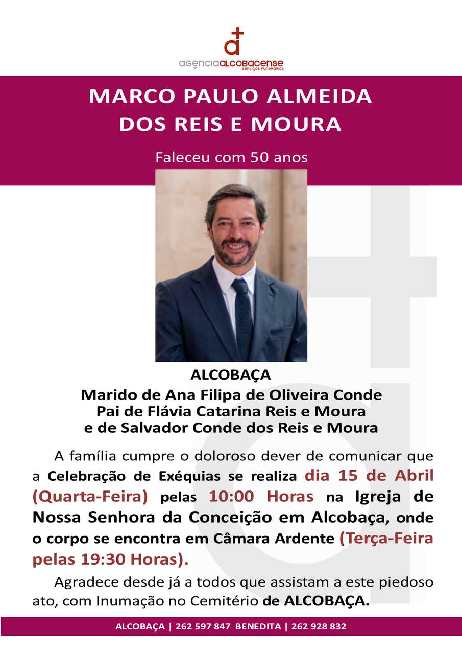 Funeral: dia 15 de Abril (Quarta-Feira) pelas 10:00 horas Celebração das Exéquias na Igreja de Nossa Senhora da Conceição em Alcobaça seguindo para o Cemitério de Alcobaça.